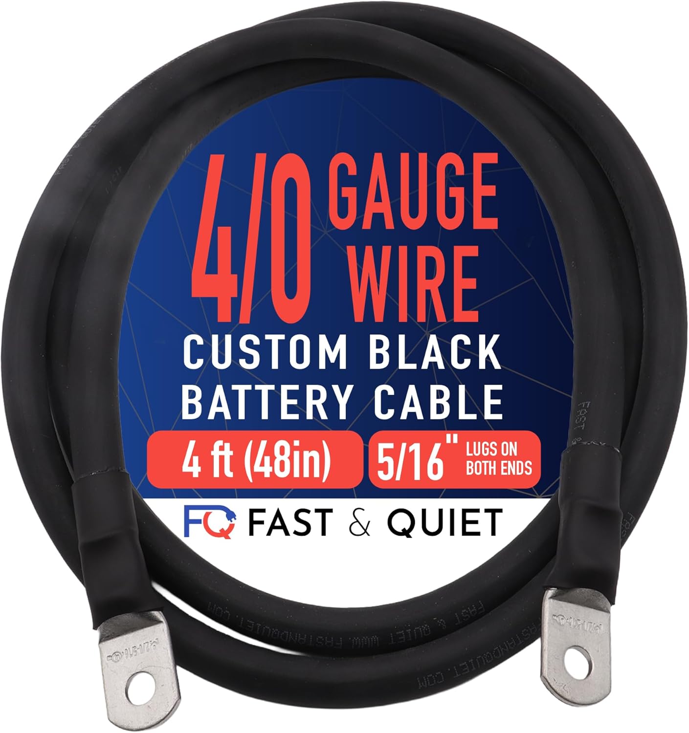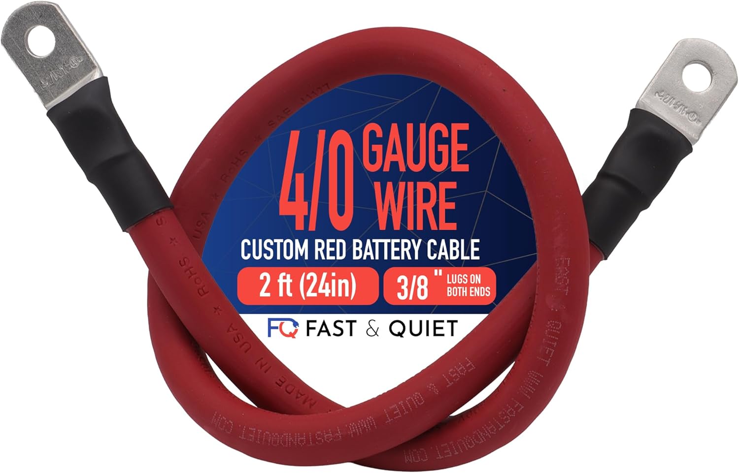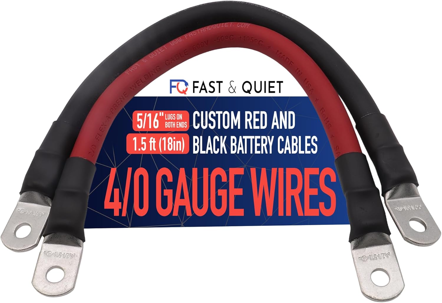 4/0 Gauge Battery Cables – Red and Black Wire, 1 Foot (12 Inches), 5/16" Lugs on Both Ends – Made in the USA, these high-quality 0000 gauge wires are designed for heavy-duty performance in automotive, marine, RV, and industrial applications. With 1 Foot (12 Inches) lengths of red and black cable, they have heavy duty battery terminal that is tinned copper lugs on both ends. The lugs feature a closed-end design to reduce moisture exposure, which helps prevent wire corrosion and ensures long-lasting, reliable connections. The cables are made with pure copper wire, providing superior conductivity for efficient power transfer. Each end is fitted with black, adhesive-lined heat shrink, which forms a protective seal against moisture and environmental damage. This ensures the cable stays durable, even when exposed to water, oil, grease, or extreme temperatures. The 0000 AWG battery cable is insulated with high-grade EPDM, resistant to cuts, abrasions, and tears. They can withstand temperatures ranging from -50°C to 105°C (-58°F to 221°F), making them reliable in both hot and cold climates. RoHS compliant, it meets SAE J1127 and ASTM B-172 standards, ensuring quality and safety. Perfect for various applications, including power inverters, solar panel systems, battery disconnects, grounding straps, and more. It’s ideal for cars, motorcycles, golf carts, marine, and RV battery systems. Available in 5/16" battery terminals. Manufactured in the United States with welding-grade copper wire sourced domestically. By choosing this cable, you’re supporting American manufacturing and ensuring you receive a high-quality, durable product.