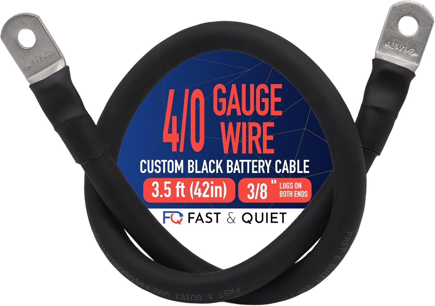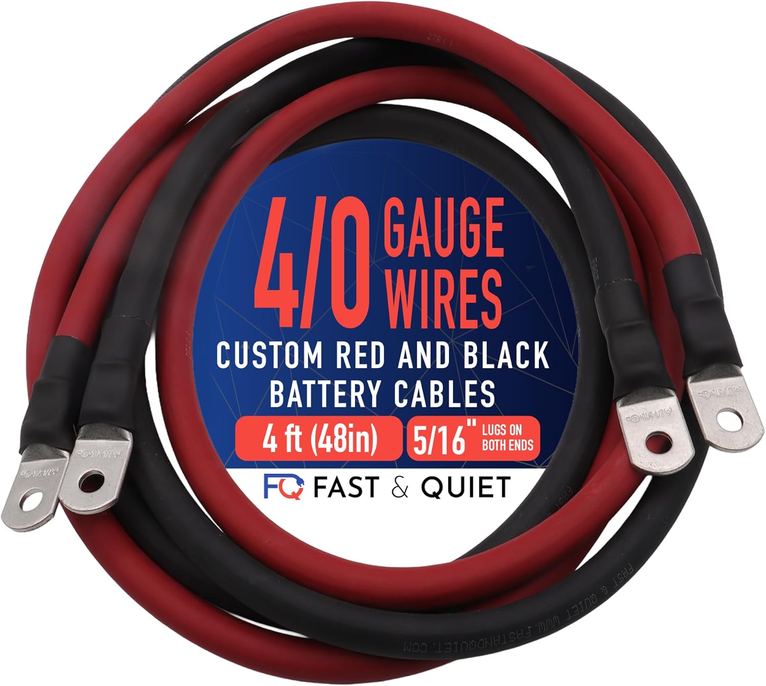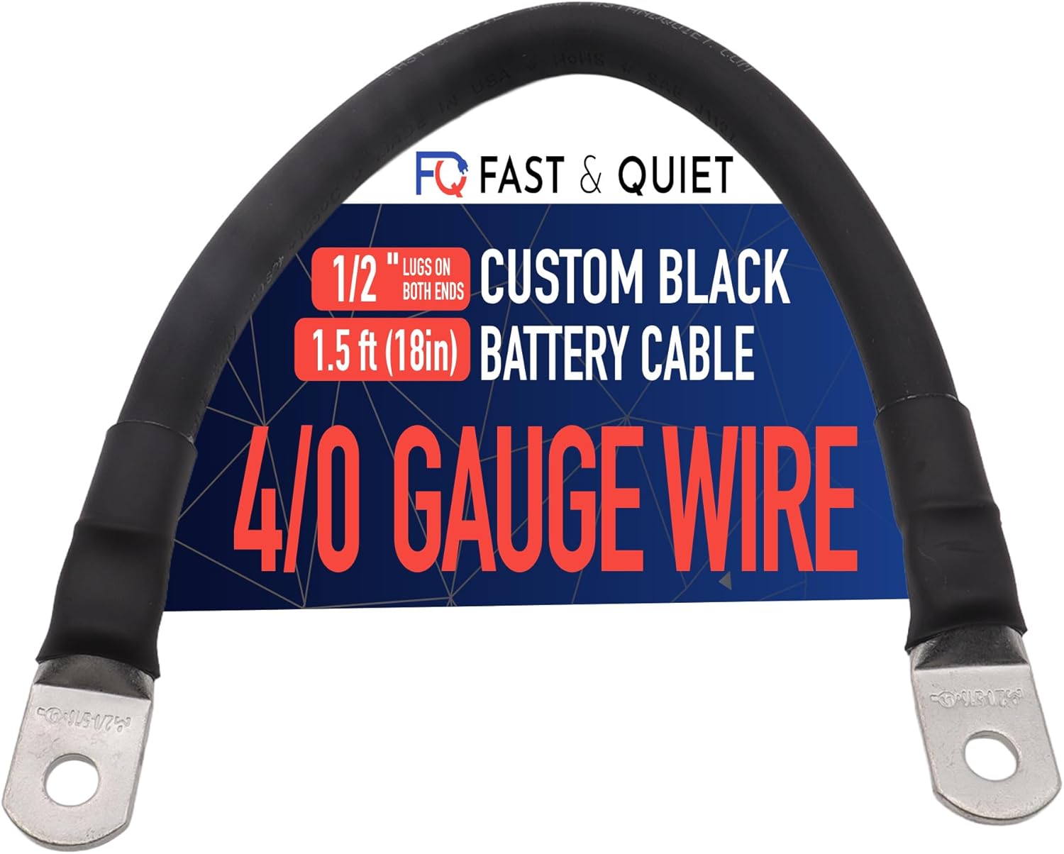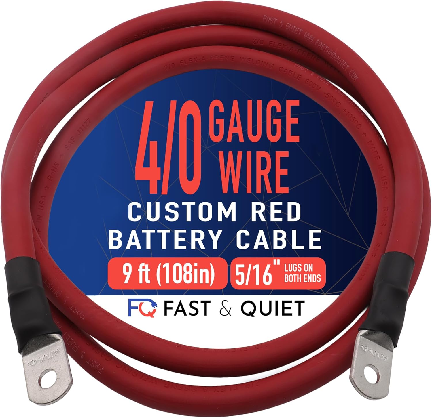 4/0 Gauge Battery Cables – Red and Black Wire, 1 Foot (12 Inches), 5/16" Lugs on Both Ends – Made in the USA, these high-quality 0000 gauge wires are designed for heavy-duty performance in automotive, marine, RV, and industrial applications. With 1 Foot (12 Inches) lengths of red and black cable, they have heavy duty battery terminal that is tinned copper lugs on both ends. The lugs feature a closed-end design to reduce moisture exposure, which helps prevent wire corrosion and ensures long-lasting, reliable connections. The cables are made with pure copper wire, providing superior conductivity for efficient power transfer. Each end is fitted with black, adhesive-lined heat shrink, which forms a protective seal against moisture and environmental damage. This ensures the cable stays durable, even when exposed to water, oil, grease, or extreme temperatures. The 0000 AWG battery cable is insulated with high-grade EPDM, resistant to cuts, abrasions, and tears. They can withstand temperatures ranging from -50°C to 105°C (-58°F to 221°F), making them reliable in both hot and cold climates. RoHS compliant, it meets SAE J1127 and ASTM B-172 standards, ensuring quality and safety. Perfect for various applications, including power inverters, solar panel systems, battery disconnects, grounding straps, and more. It’s ideal for cars, motorcycles, golf carts, marine, and RV battery systems. Available in 5/16" battery terminals. Manufactured in the United States with welding-grade copper wire sourced domestically. By choosing this cable, you’re supporting American manufacturing and ensuring you receive a high-quality, durable product.